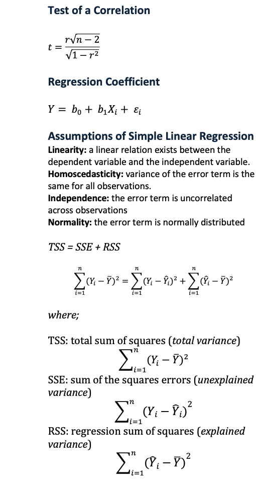 Test of correlation, regression coefficient, Assumptions of SLR, Total sum of squares of formula