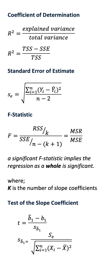 Coef of determination, SE of estimate, F-Stat, test of slope coefficient