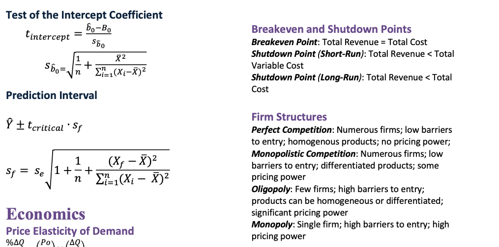 Test of intercept coefficient, prediction interval, break even and shutdown points, firm structures