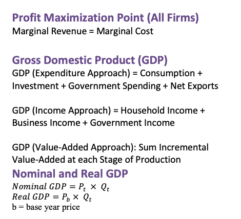 Profit max point (all firms), GDP income and exp approach, Nom and real GDP