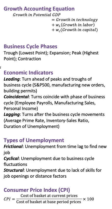 Growth accounting eq, Econ indicators, types of unemployment, CPI