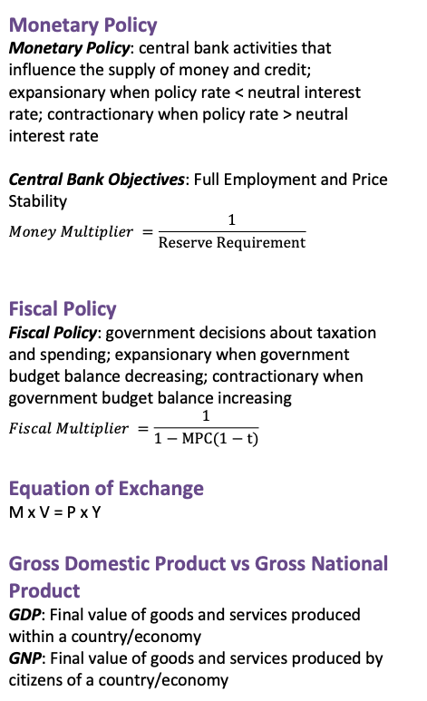 MP and CB objectives, FP and multiplier, EQ of exchange, GDP vs GNP