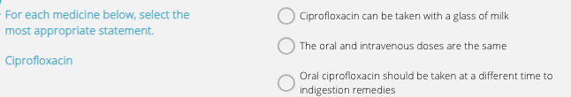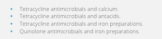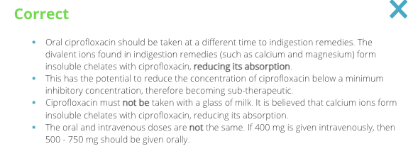 Milk: Calcium ions form insoluable chelates with ciprofloxacin, making it because sub-therapeutic