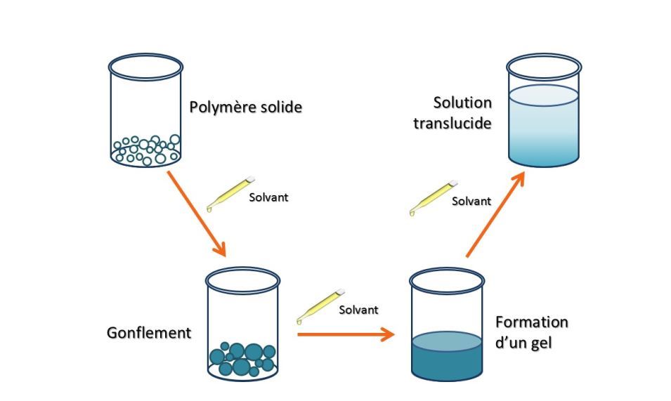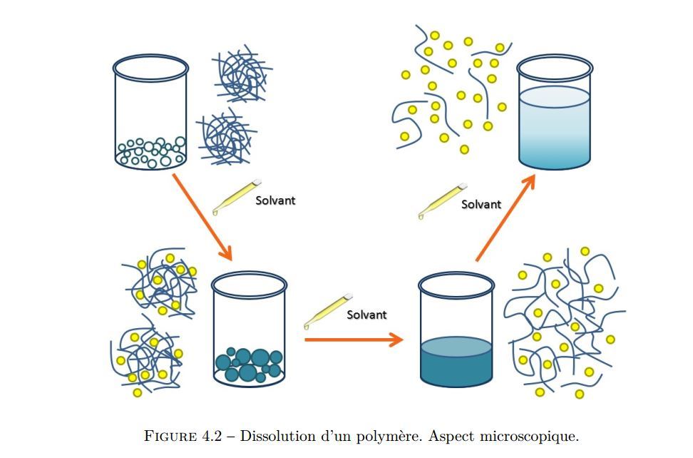Les molécules de solvant penetrent petit à petit les polymères jusqu’à ce qu’ils se séparent complétement