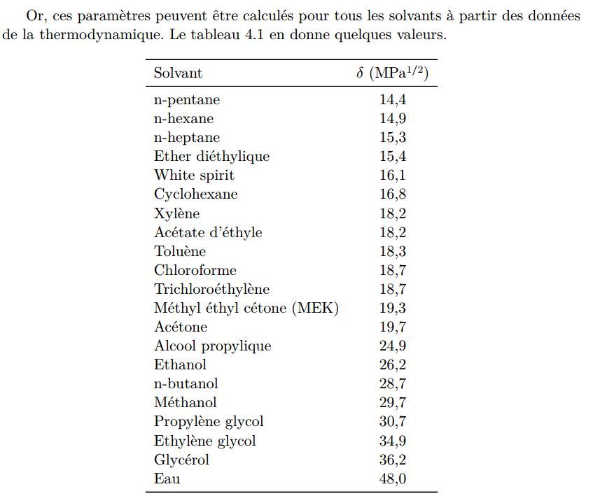 Dans un solvant, on estime qu’on sacrifie les forces de dispersion, on a donc les 2 forces de polarisation et hydrogène, le système de hansen permet de savoir si un mélange est bien soluble
