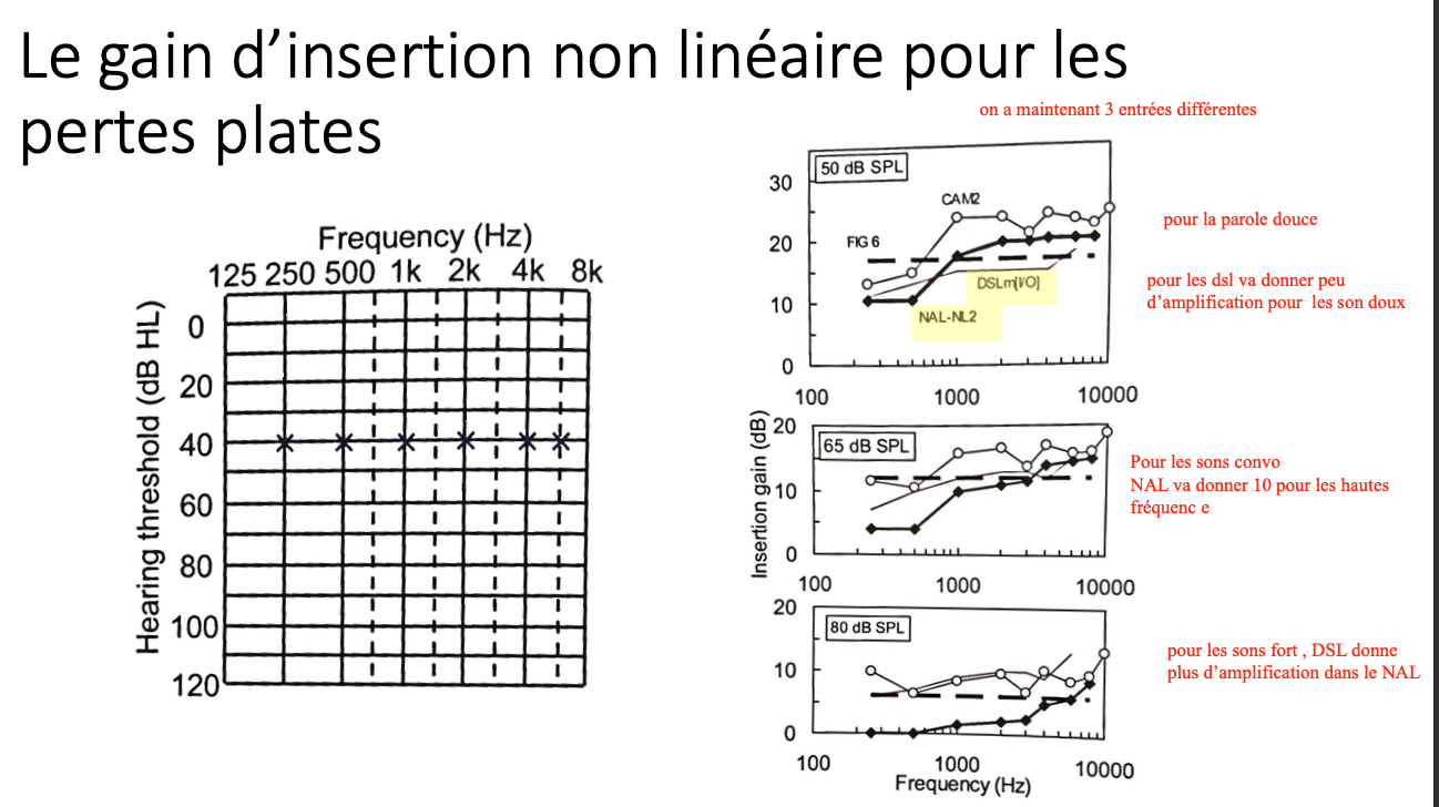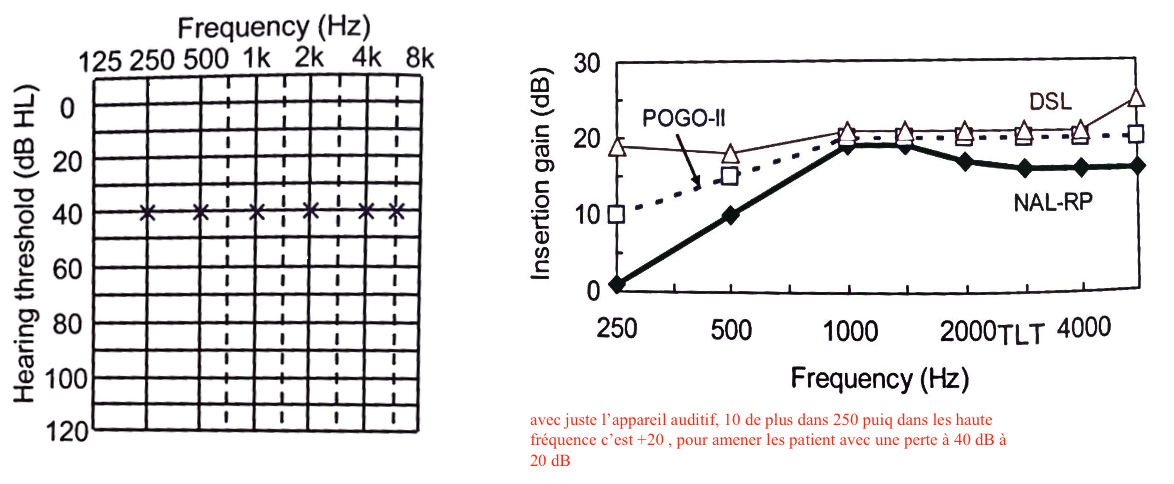 avec juste l’appareil auditif, 10 de plus dans 250 puis dans les haute fréquence c’est +20 , pour amener les patient avec une perte à 40 dB à 20 dB