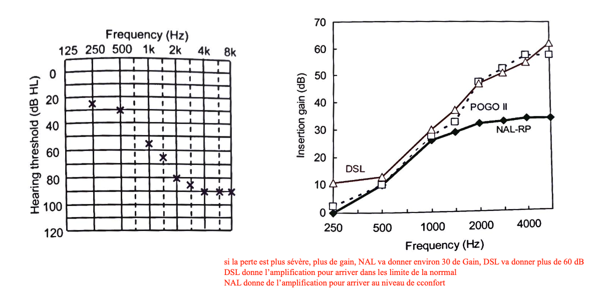 si la perte est plus sévère, plus de gain, NAL va donner environ 30 de Gain, DSL va donner plus de 60 dB