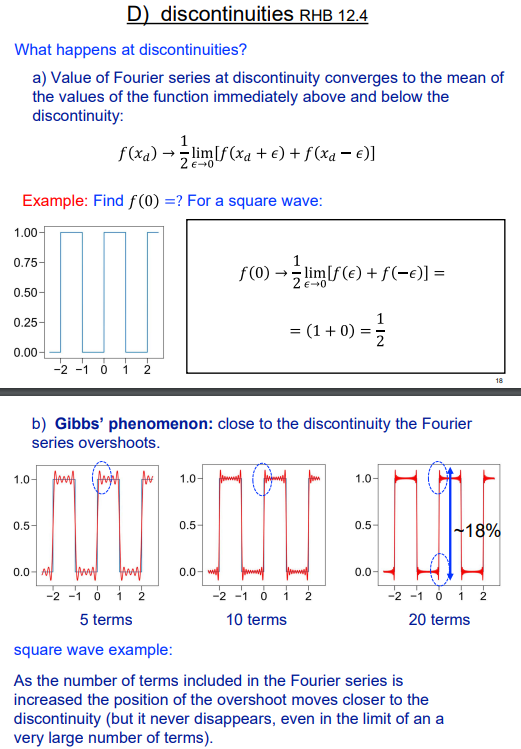 Fourier series overshoots at discontinuities, this overshoot NEVER dissapears or changes in size but the position of the overshoot does move CLOSER to the discontinuity as the number of terms included increases.