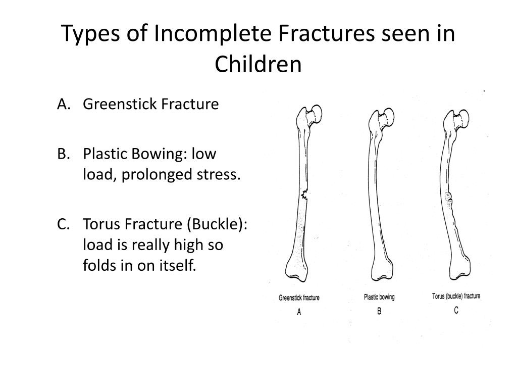 What are the 3 types of incomplete fractures seen in children?