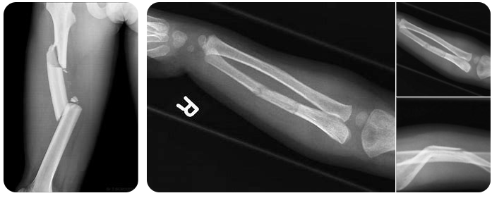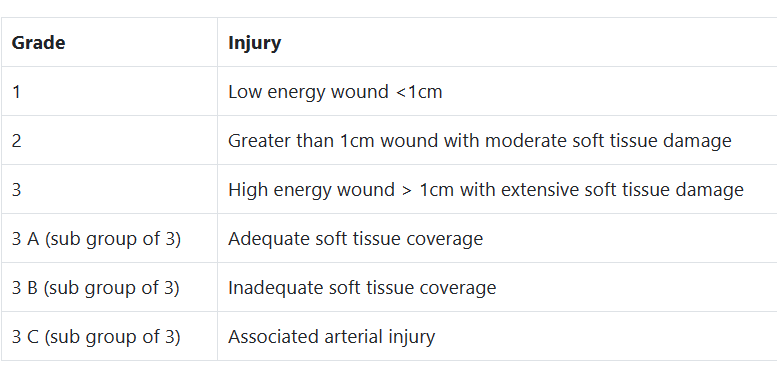 disruption of the bony cortex associated with a breach in the overlying skin.