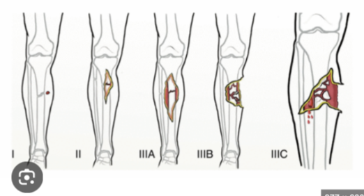 It is also important to distinguish open from closed injuries. The most common classification system for open fractures is the Gustilo and Anderson classification system