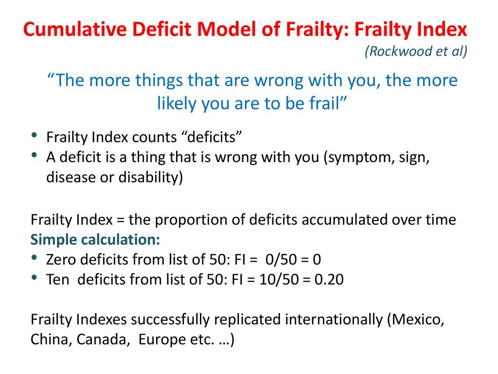 Cumulative deficit model: the more things wrong with a patient the more likely they are to be frail - each aspect e.g. hearing loss, tremor, congitive changes, are given points which are added together to give a score