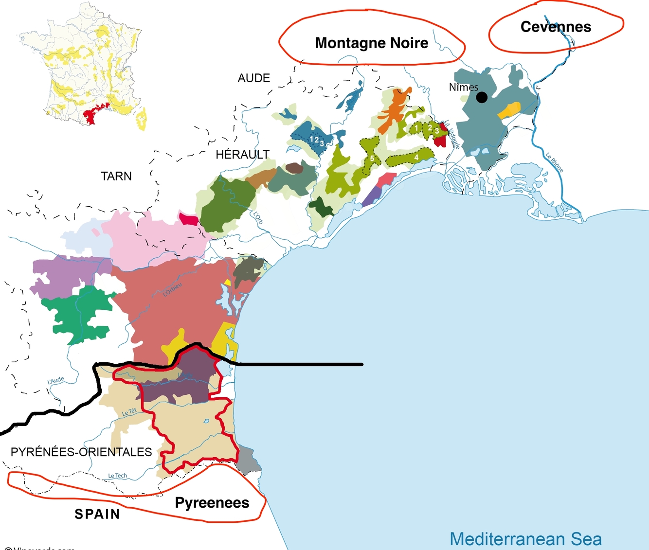 Languedoc (Mediterranean climate) acocunts for 90% of the Production, Rousillon (Pyranees provide more microclimates) is only 10%.