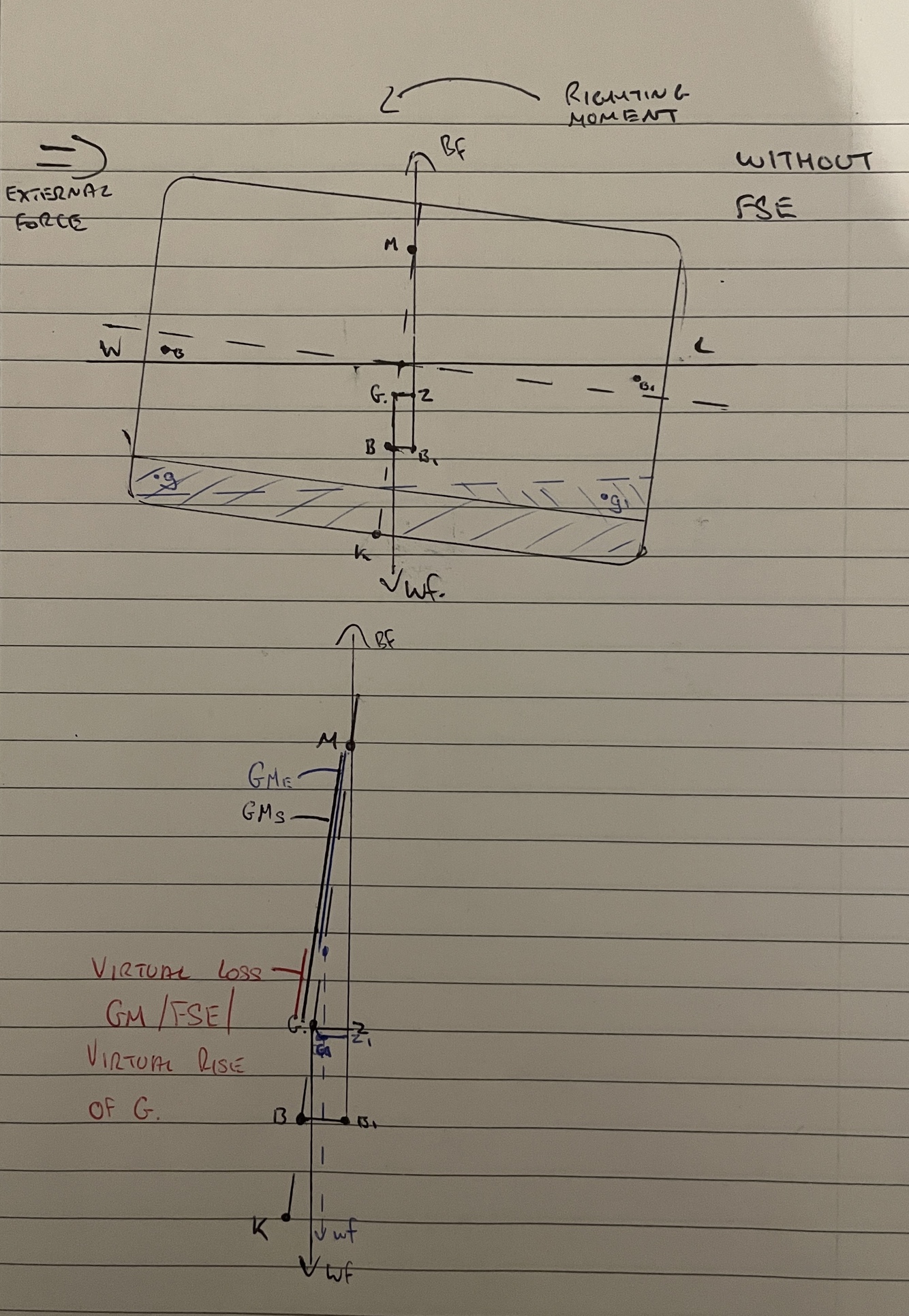 Sketch a transverse picture of a vessel at a angle of heel under the influence of FSM