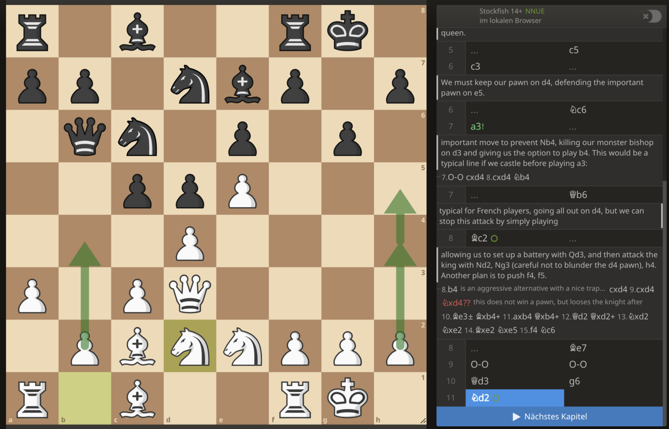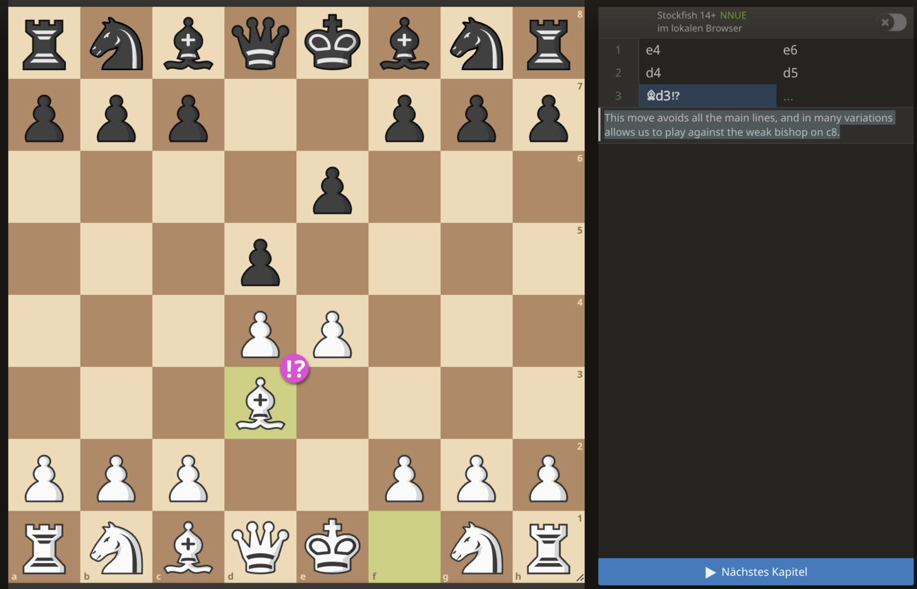 After 1. e4 e6, 2. d4 d5, we do NOT exchange pawns, but play Bd3 (Schlechter Variation). This move avoids all the main lines, and in many variations allows us to play against the weak French bishop on c8.