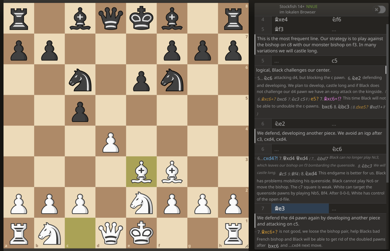 We play 4. Bxe4 Nf6, 5. Bf3. Our strategy is to play against the bishop on c8 with our monster bishop on f3. In many variations we will castle long. We defend d4 with pieces (Ne2, Be3) to avoid an IQP.