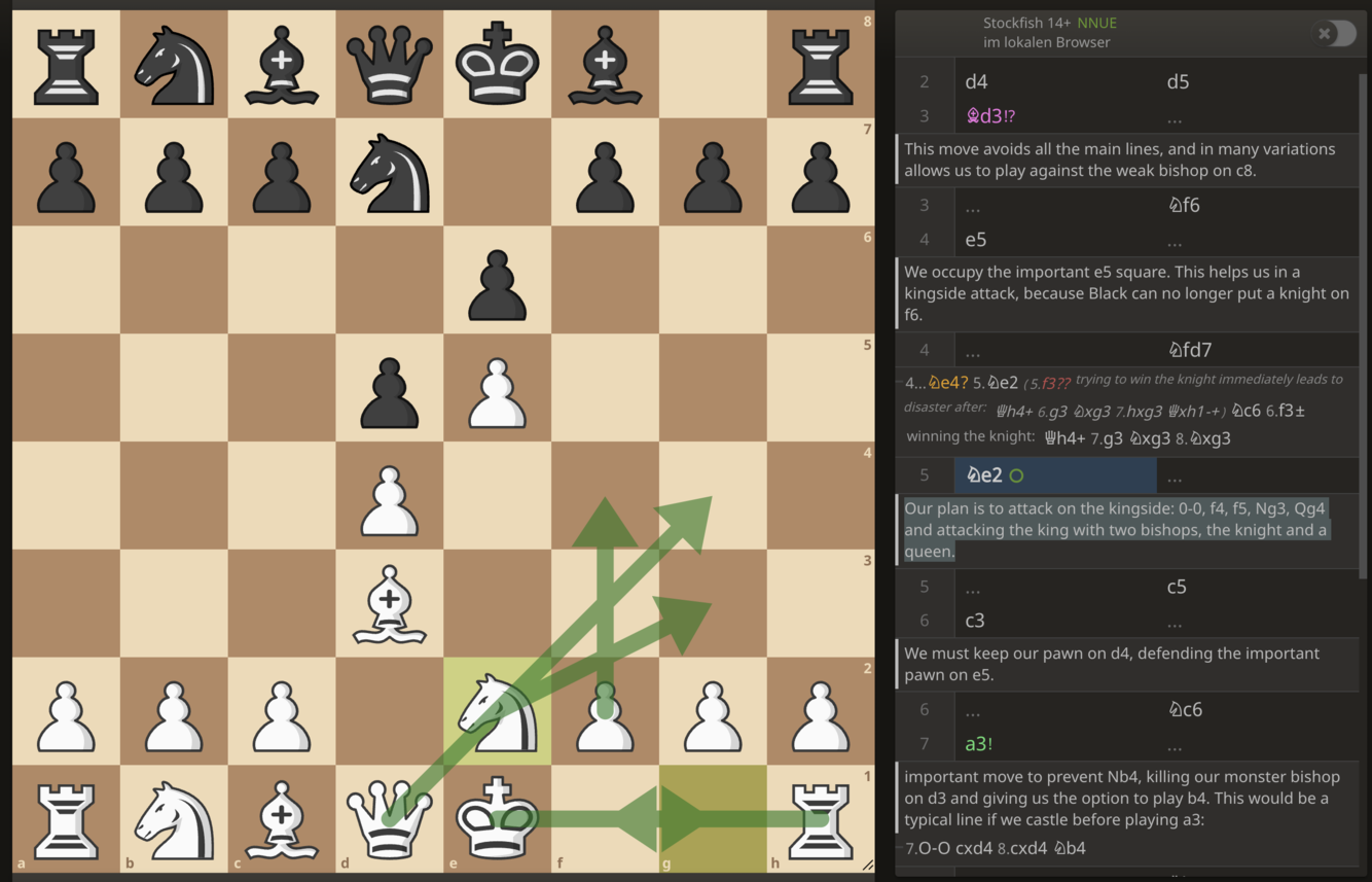 We push e5. Then we play Ne2. Our plan is to attack on the kingside: 0-0, f4, f5, Ng3, Qg4 and attacking the king with two bishops, the knight and a queen.