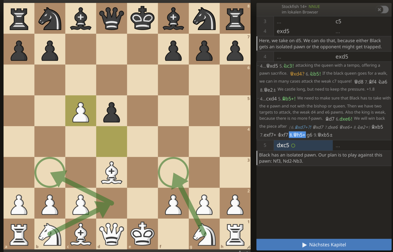 We take exd5 to create an IQP. We then play against the IQP with Nf3, Nd2-Nb3.