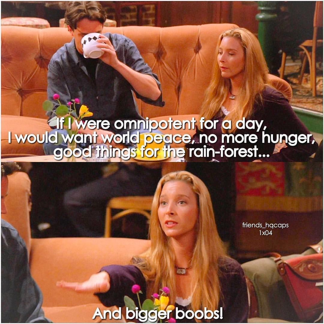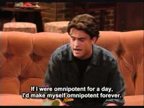 Chandler : Uh, if I were omnipotent for a day, I’d.. make myself omnipotent forever. Rachel : See, there’s always one guy. (MOCKING) “If I had a wish, I’d wish for three more wishes.”