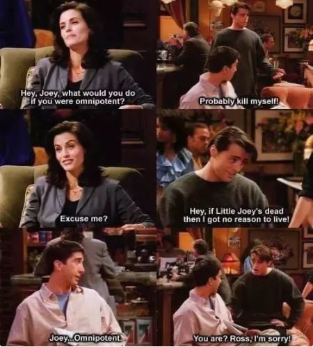 “Monica: Hey, Joey! What would you do if you were OMNIPOTENT?
