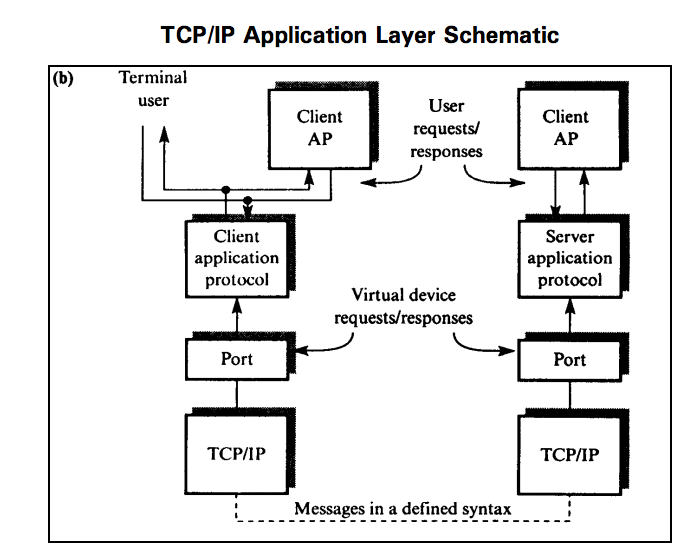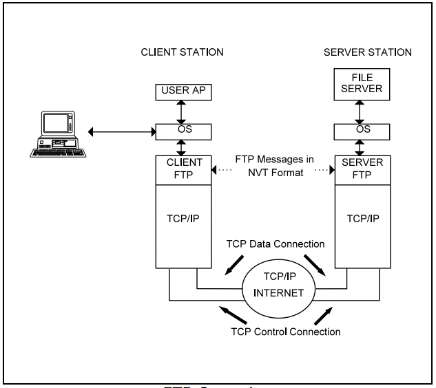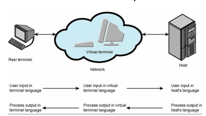 Nework Virtual Terminal - common paradigm so client and server stations can talk to each other. An NVT is an imaginary device with a well-defined set of characteristics. Using the VTP, aconnection is set up between a terminal user and a remote host. Both sides generate data and control signals in their native language. Each side translates its native data and control signals into those of the NVT and translates incoming NVT traffic into its native data and control signals. Normally, all data is transferred as 7-bit ASCII character strings.