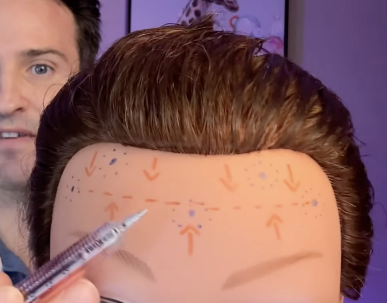 Inject 1 unit with more injection points, spread at least 1.5-2cm apart. Drawing points evenly is important for even distribution. Injecting 1 unit is more forgiving.