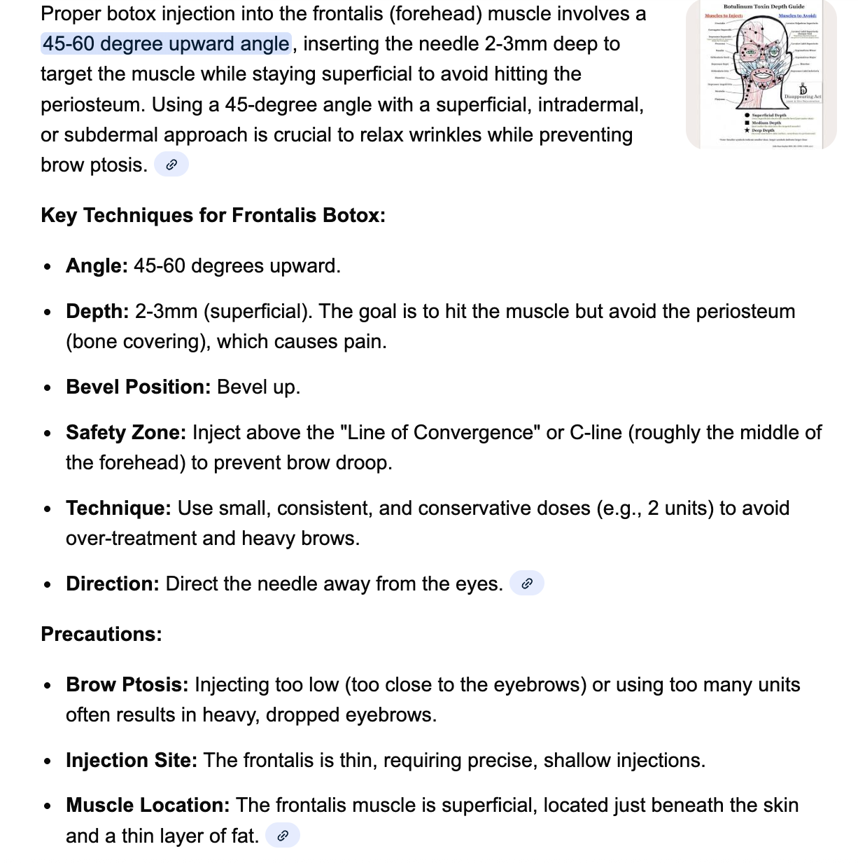 At what angle should you inject Botox into frontalis muscle? How many mm deep to prevent pain in periosteum?