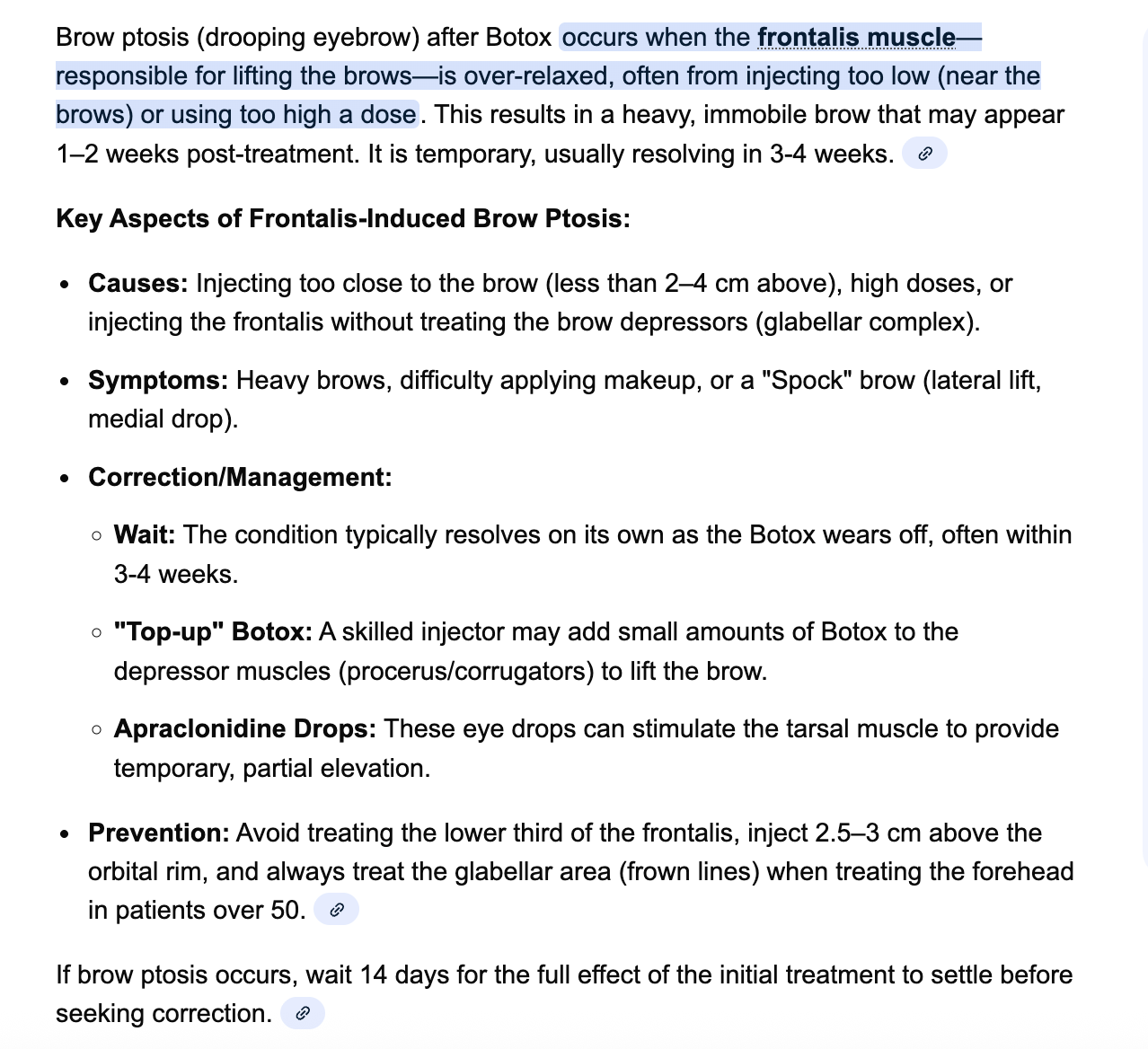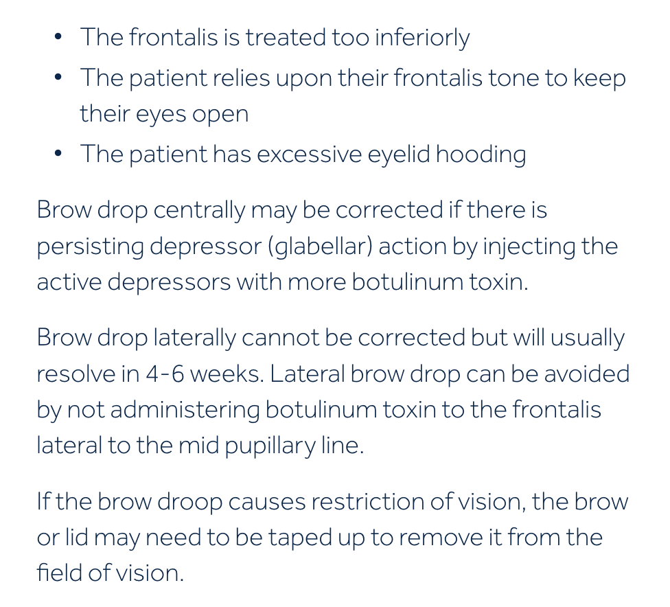 Injections of frontalis should be in upper half not lower half to prevent brow ptosis. 2.5cm above superior orbital rim. Brow ptosis can occur if too many units placed laterally