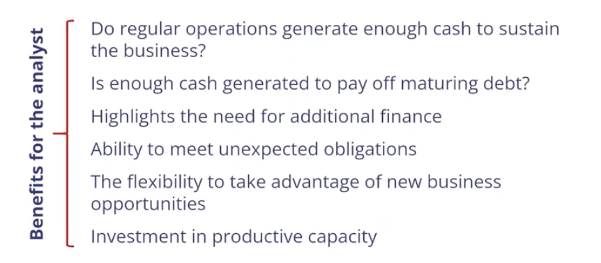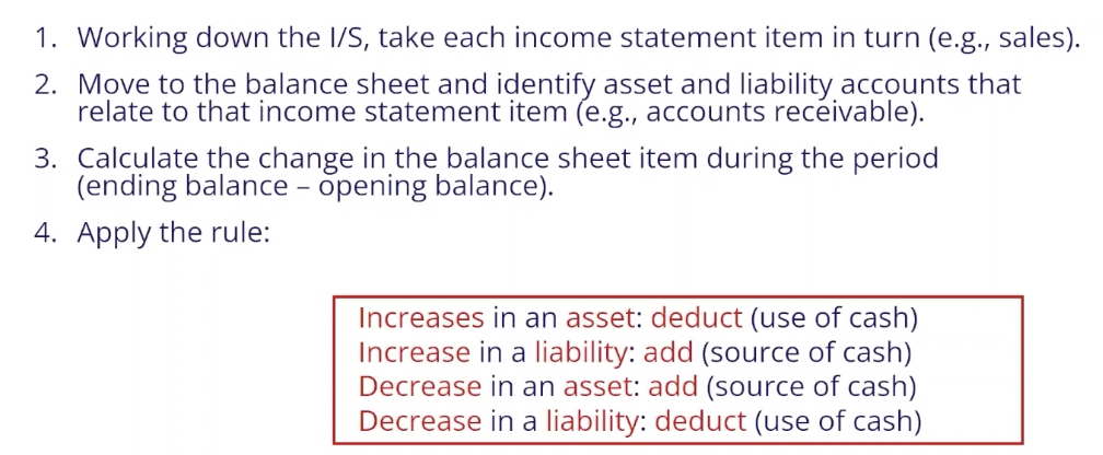 KEY - removes non has charges (like depreciation and amortisation), which are characteristics of the income statement but are now actually backed by cash flow