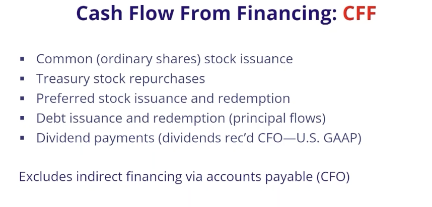 cash that we raise when we issue new debt and equity, cash we spend when we repurchase shares, treasury stock, or when we pay off principal or debt