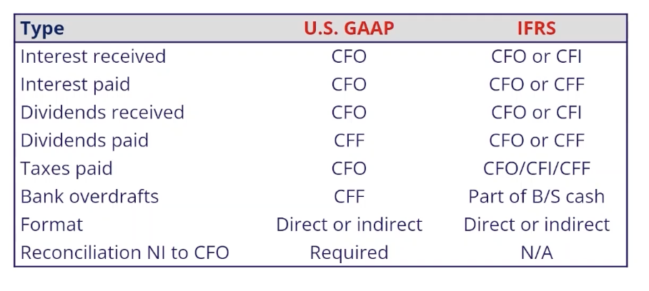 dividends received under US GAAP are recorded in CFO, dividends paid are recorded in CFF