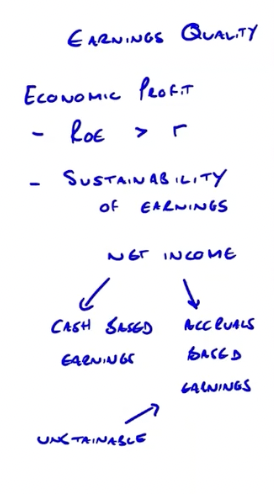- net income: cash based earnings, and accruals based earnings (idea here is the idea that cash based earnings are of higher quality than accruals based earnings)