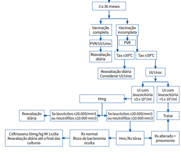 Pacientes entre 3-36 meses, com FSSL, vacinação incompleta e Tax > 39, quando fazer apenas avaliação diária sem ATB