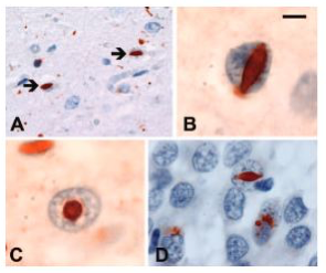 At a microscopic level we see marked gliosis and significant neuronal loss. Markers of the disease include: