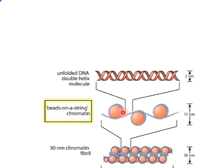 linear DNA => nucleosome fiber (beads on a string) => solenoid (30 nm)