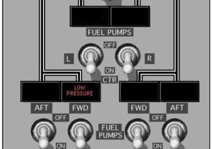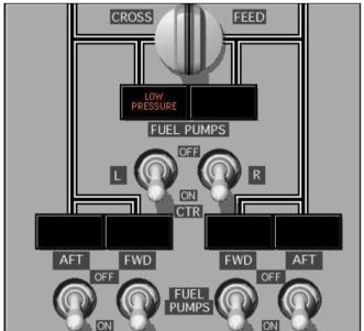 d. The left center tank pump switch must be turned OFF, leaving insufficient pressure to supply center tank fuel to both engines unless the Crossfeed is open.