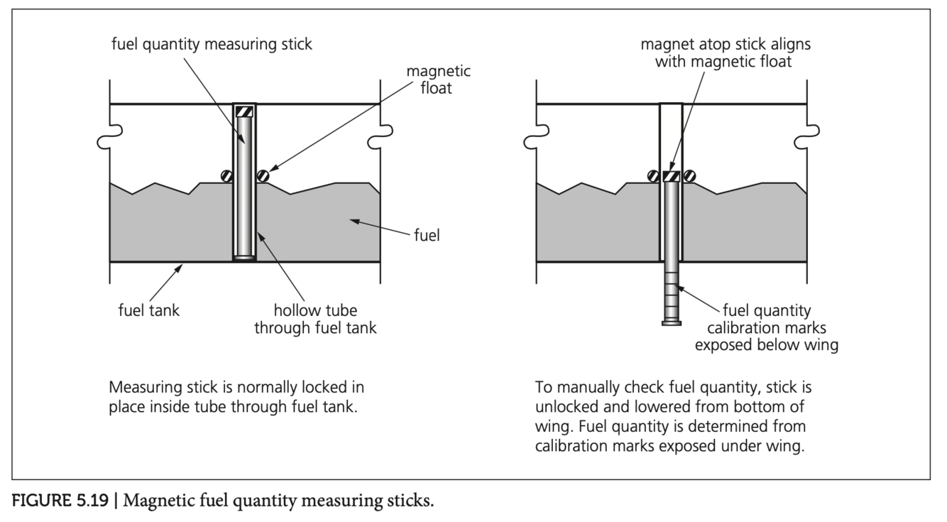 A fuel quantity measuring stick measures fuel quantity from beneath the wings. It is located in one or more hollow tubes that run vertically through each fuel tank.