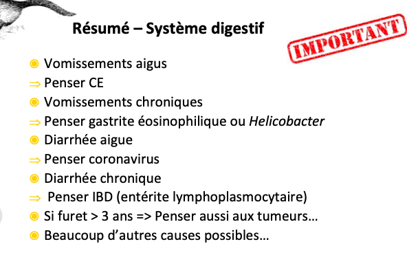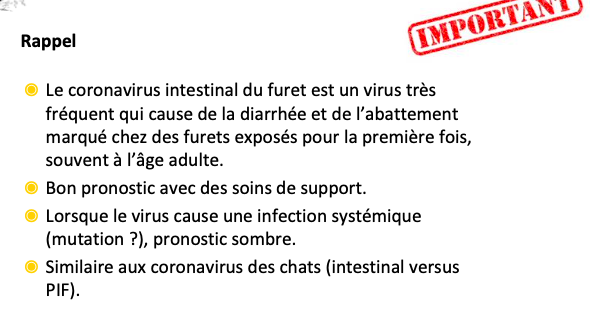 => tous les furets seront possiblement porteurs par la suite (diarrhée chronique)