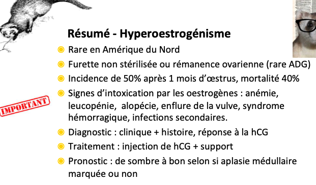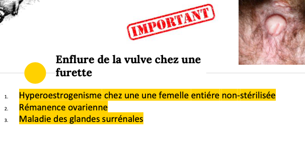 Furet femelle NS de 18 mois, présentée pour abattement, poil clairsemé le long des flancs et enflure de la vulve persistant depuis 1 mois. À quelle(s) condition(s) pensez-vous?