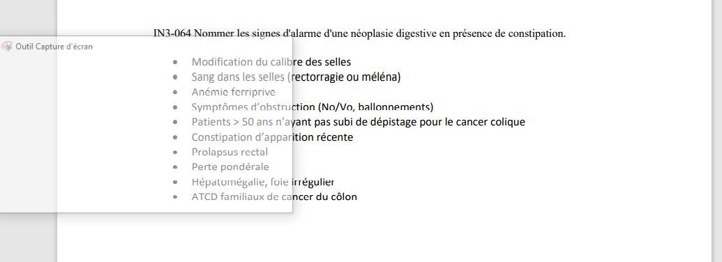 v/f la présence d’un prolapsus rectal et d’une modification du calibre des selles sont des signes d’alarme de Néoplasie en constipation