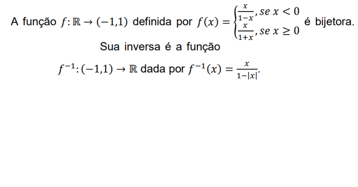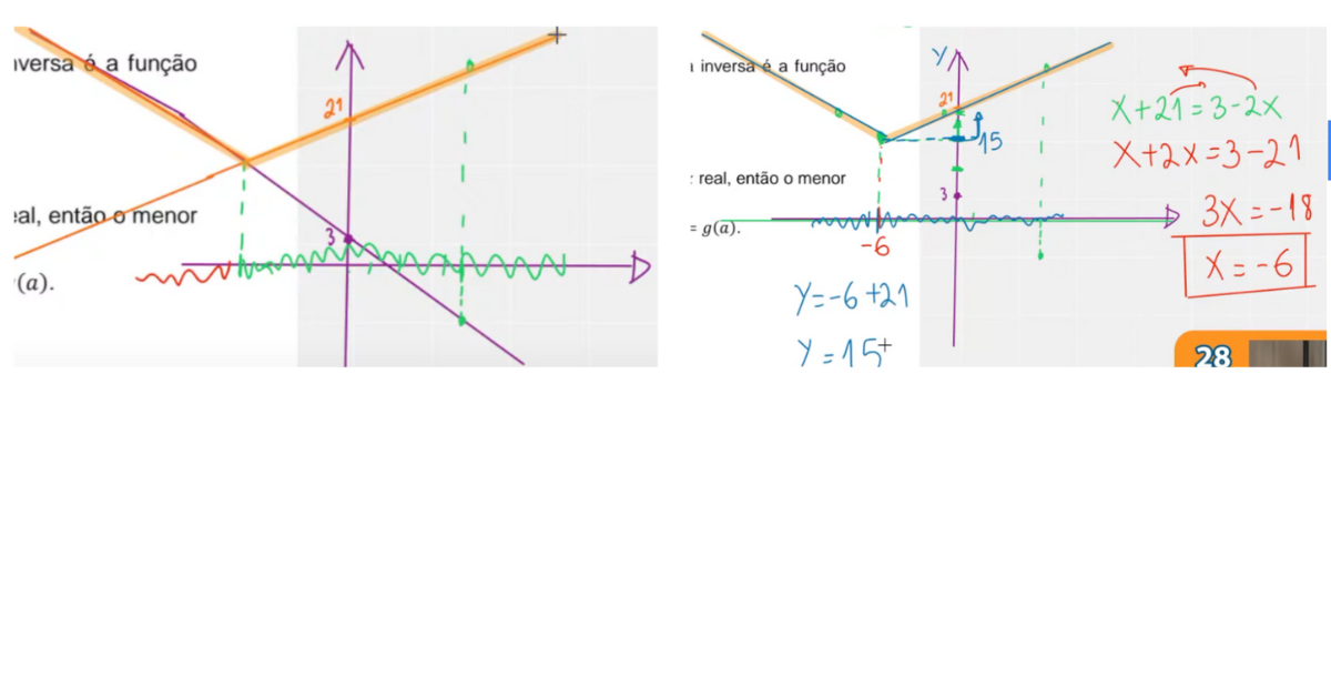 Se 𝑓: ℝ → ℝ é a função que associa a cada 𝑥 real o maior valor entre 𝑥 + 21 e 3 − 2𝑥, então 𝐼𝑚(𝑓) = [15, +∞[.