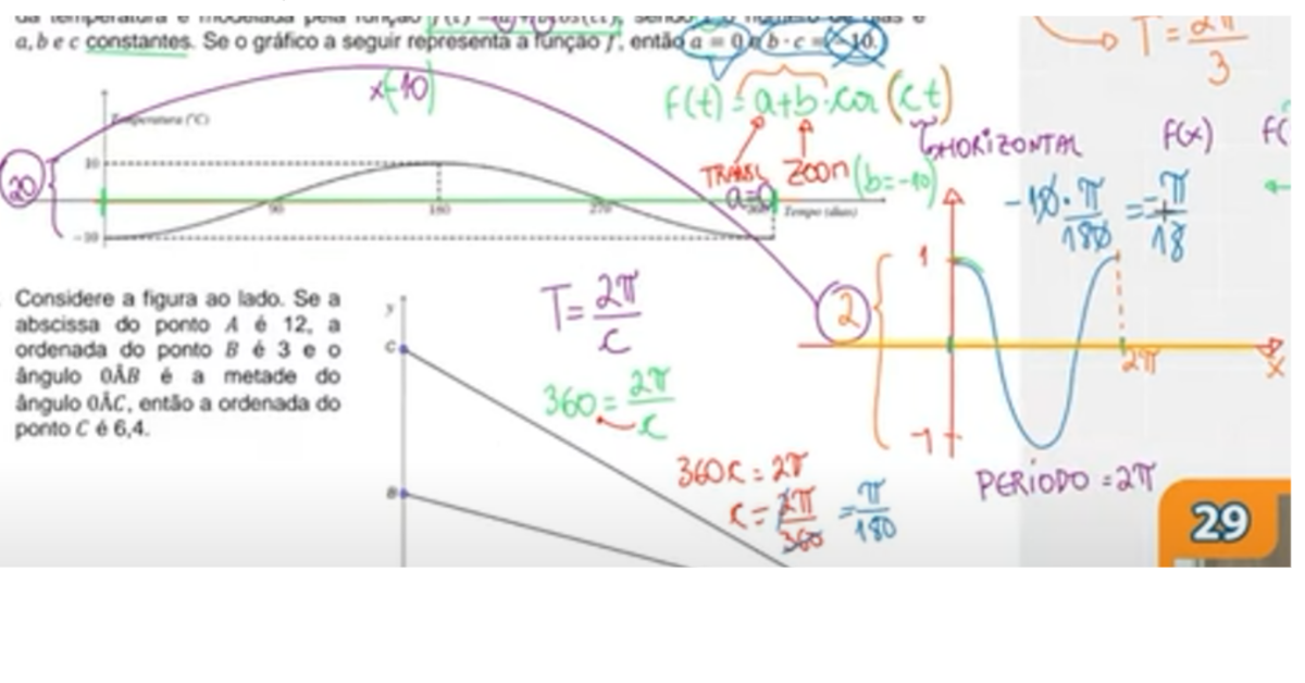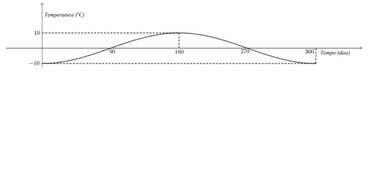 Em regiões muito frias, construtores de tubulação utilizam placas isolantes para evitar transferência de calor da tubulação para o solo. No desenvolvimento desse tipo de placa, leva-se em conta a variação da temperatura da região ao longo do ano (360 dias). A variação da temperatura é modelada pela função 𝑓(𝑡) = 𝑎 + 𝑏𝑐𝑜𝑠(𝑐𝑡), sendo 𝑡 o número de dias e 𝑎, 𝑏 𝑒 𝑐 constantes. Se o gráfico a seguir representa a função 𝑓, então 𝑎 = 0 e 𝑏 ∙ 𝑐 = −10.