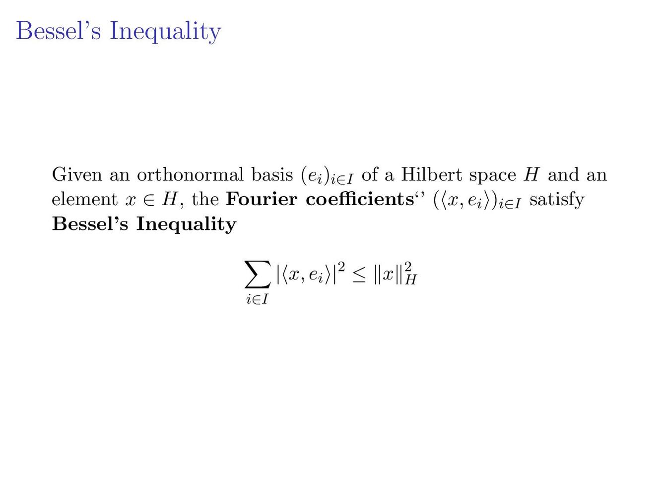 Given an orthonormal basis, write down the Fourier Coefficients and Bessel’s Inequality.