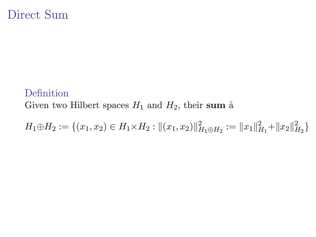 Define the direct sum of Hilbert Spaces, and its inner product.