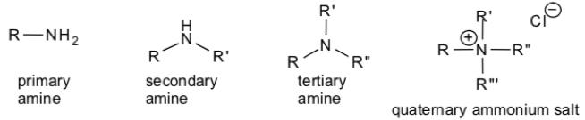 Draw a primary, secondary and tertiary amine and a quaternary ammonium salt