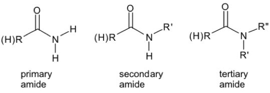 Draw a primary, secondary, tertiary and cyclic amide.