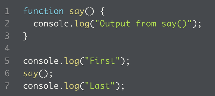 the code say() is described as a function call to the say function. When JavaScript runs this program, it creates a function named say whose body causes JavaScript to print the text Output from say() when the function executes.