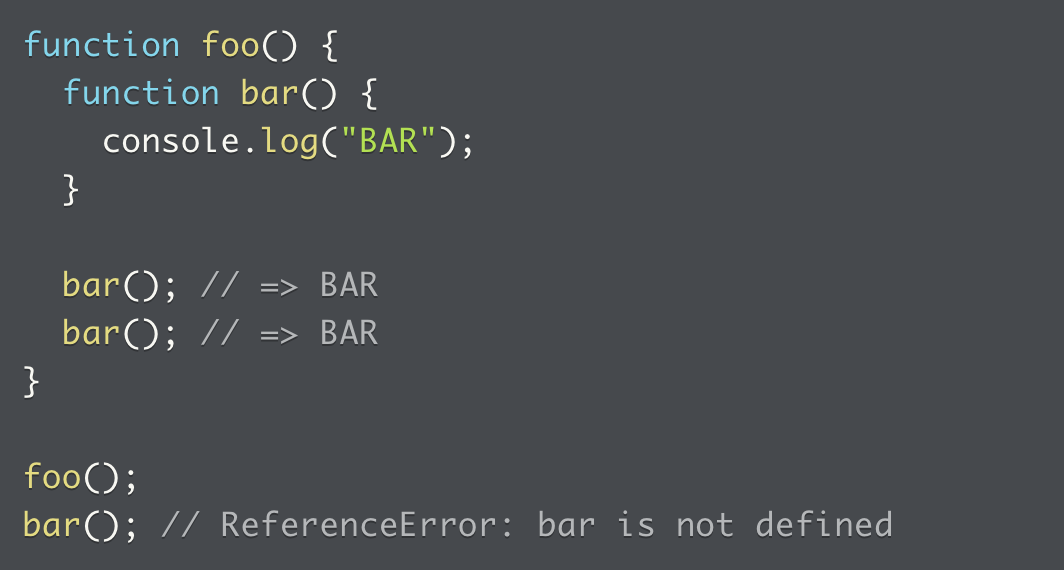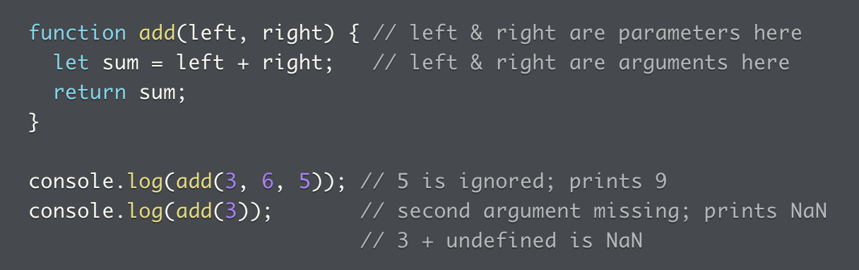 Function names and parameters are both considered variable names in JavaScript. Parameters, in particular, are local variables (the scope of the variable defined by the parameter is the function definition; you can’t use it outside the function’s body). They are defined locally within the function’s body. Function names are either global or local, depending on whether the function is at the program’s top level or nested inside a class, object, or another function.