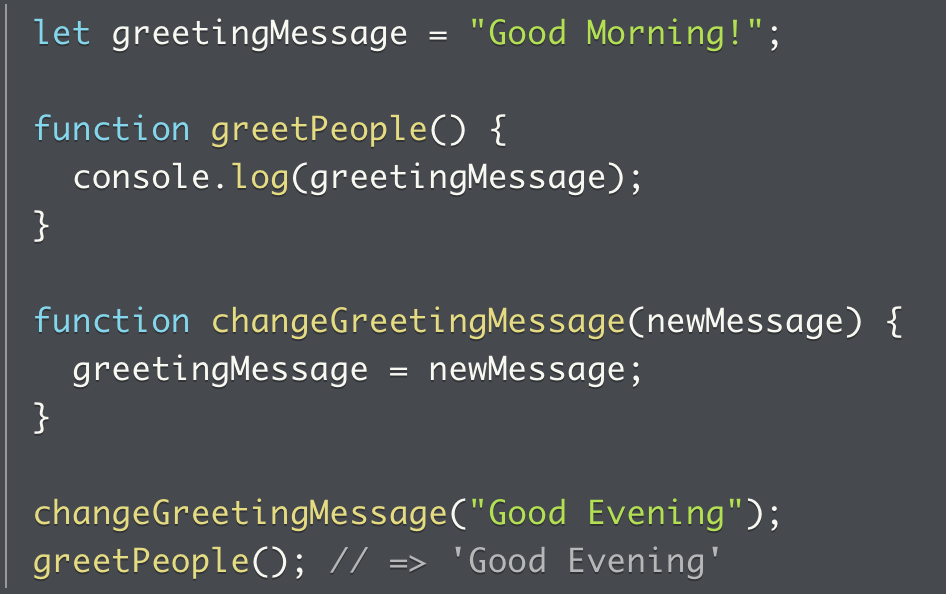 Line 11 invokes the function, passing in the ‘Good Evening’ string, which becomes the new value for the global greetingMessage.