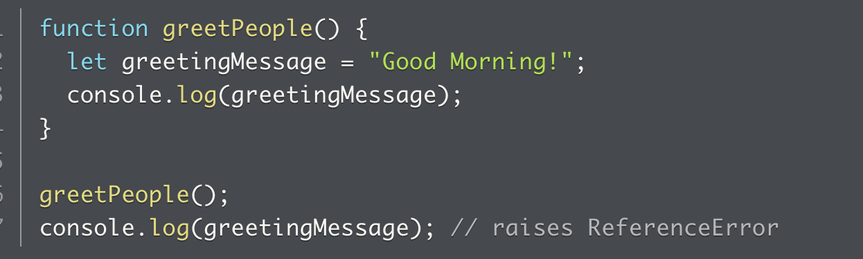 The greetPeople function declares greetingMessage internally. It’s accessible within the function, but a ReferenceError occurs if you try to use it elsewhere.